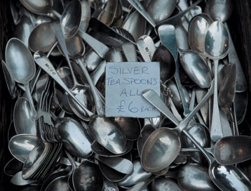 «Не хочу сказать, что все рыночные торговцы сомнительные типы, а владельцы магазинов – наоборот. Просто когда у вас есть свой бизнес, вы не можете себе позволить передергивать карты», – уверяет меня Майкл Дэвидсон, чей магазин антикварной мебели на Вестбурн-гроув существует уже 35 лет. В невероятной тесноте – всего шесть квадратных метров – можно найти истинные жемчужины. Такие вот продавцы в крошечных лавчонках составляют «соль» лондонских антикварщиков. Годами Майкл спозаранку выходит на Портобелло, и ему случалось отыскать здесь уникальные вещи, например барометр в стиле «чиппендейл». Однако… «Не тешьте себя напрасными иллюзиями, – предупреждает он, - все хорошее стоит дорого, раскупается мгновенно, и никто, даже самый искушенный дилер, не застрахован от ошибок. Вы должны хорошо знать, что ищете, сколько это должно стоить и как отличить оригинал от подделки. Единственный выход – прийти со специалистом, иначе надуют: это же все-таки рынок! Нет, уверяю вас, ни одного человека моей профессии, который хотя бы раз в жизни не прокололся бы по-крупному. Что уж говорить об обычных людях… Поэтому совет один – не покупайте на улице ничего особенно дорогого». По большому счету Майкл прав. Одно дело купить вазу резного стекла Галле, которая вполне может быть имитацией, и совсем другое – серебряный столовый сервиз. Впрочем, на английском серебре всегда есть пробы, по которым можно определить место, дату и имя производителя. Главное здесь – не принять анодирование за чистый металл.