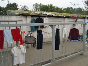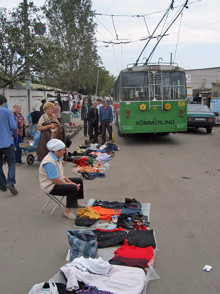 Троллейбус едет буквально в полуметре от разложенных на земле товаров, а точнее - товары раскладывают, отступив полметра от колеи. На заднице троллейбуса написано название немецкой фирмы Кёммерлинг, она, как я посмотрел в интернете, занимается изоляционными материалами, окнами, дверьми. Блошиный рынок идёт вдоль бетонного забора (он виден слева), справа его ограничивают несколько кирпичных одноэтажных зданий. Ещё правее - ещё один проход, занятый рынком. Рынок не велик.