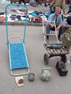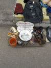 Покрытые ржавчиной (но вовсе не грязные) железяки не удостоились места на клеёнке. На клеёнке - доминируют блестящие штучки. Я не удержался и купил электрический фонарик, который приводится в действие нажатием на педаль - в корпусе начинает жужжать спрятанная динамо-машина. Фонарик - справа внизу. Фонарик лишь жужжит, света от него нет. Так что это, скорее, физкультурно-музыкальный инструмент.