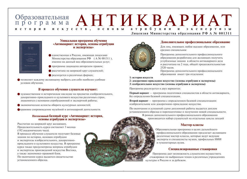 Институт культурного просветительства «КУЛЬТПРОСВЕТ» в 2003 году разработал уникальную образовательную программу «Антиквариат. История искусств. Основы атрибуции и экспертизы».
