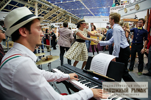 На "Юбилейной вечеринке" Блошиного рынка элегантные шляпки, котелки, звуки джаза сменялись клавишным буги-вуги! Веселый чарльстон, спонтанный линди хоп, причудливый буги-вуги, безудержный рок-н-ролл - царила славная атмосфера импровизации, которую поддержали наши друзья - Студия современного танца в стиле свинг и рок-н-ролл J.J.Stars.